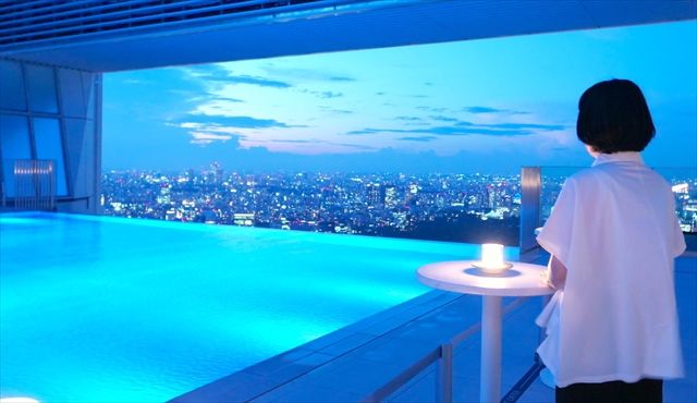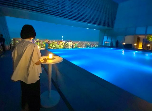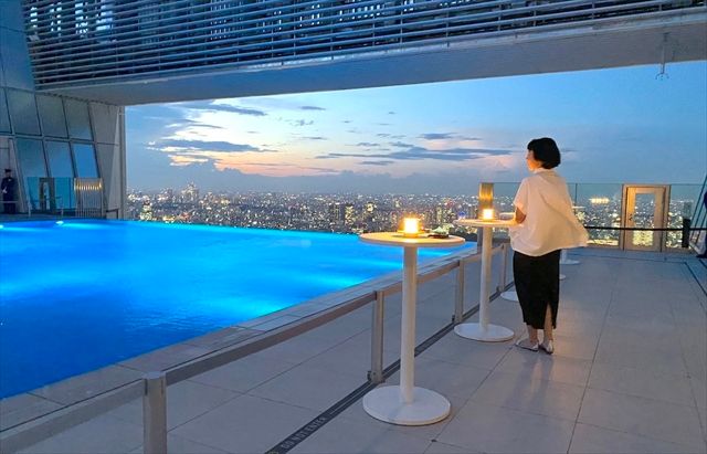 筆者らは運よく少しだけトワイライトタイムが楽しめました。完全に暗くなる前の、少し幻想的な空の色と東京の風景、インフィニティプールの組み合わせは最高。トワイライトタイムと夜景の両方を見ることができたら、ちょっと得した気分です。