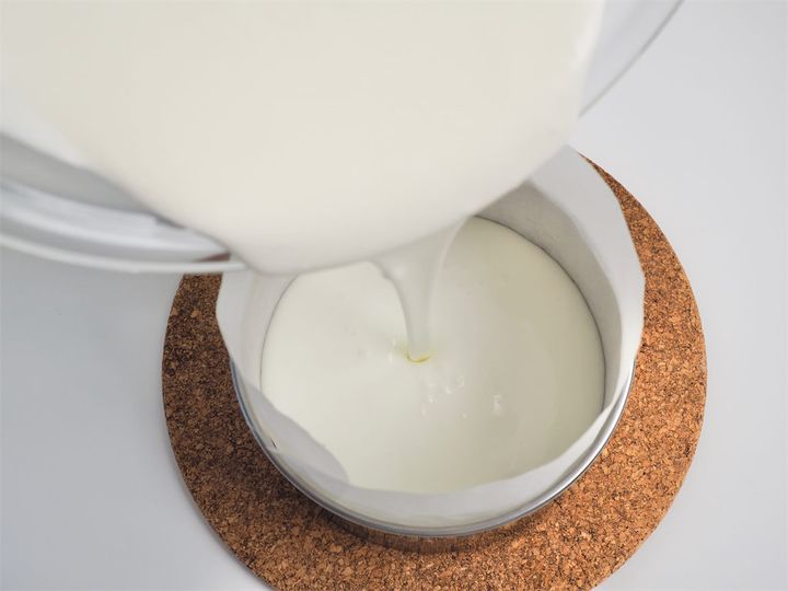 7. 冷蔵庫から取り出した36を流し入れ、軽く机にトントンと落とし空気を抜き、冷蔵庫で3時間冷やす。