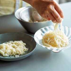 素麺を袋の表示通り茹でてザルにあげ、流水で粗熱をとり、氷水に入れてしっかり冷たくしてから水けを切ると、味がボヤけない!