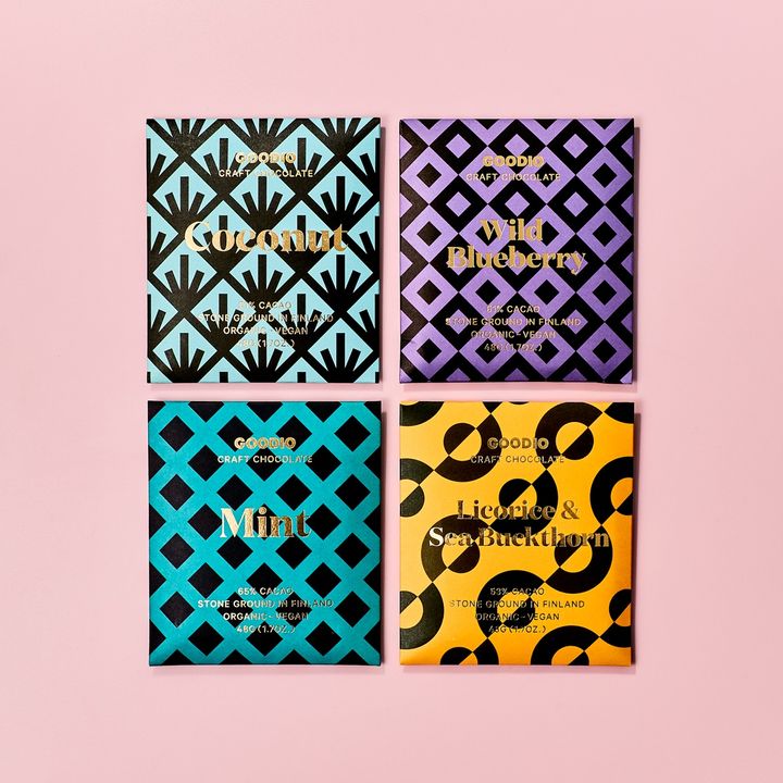 <GOODIO(グーディオ)>持続可能性・幸福・透明性の3つのテーマに基づいて設立された、フィンランド・ヘルシンキ生まれのショコラブランド。厳選された質の高いオーガニック原料を主に使い、原材料の持つ自然の栄養素をできる限り壊さないよう、最小限の加工に抑えたチョコレートづくりをしています。フレーバーごとに異なるパッケージデザインも魅力的。