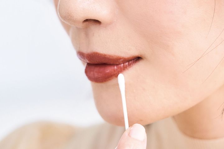 口角下、上唇山の中央部分を中心に、はみ出した部分を綿棒でオフしてシルエット調整を。唇の外側から内側に向けて綿棒を動かすのがコツ。