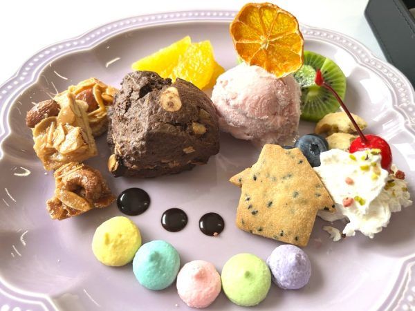あのひのスコーンプレートは手作りスコーンやクッキーなどの焼き菓子の他、アイスクリーム、5色のメレンゲ、フルーツなど盛りだくさん!まず色合いがかわいい、おしゃれですよね♪ 温かいスコーンはしっとりやわらか食感。今まで食べてきたスコーンのイメージが変わるほどです。 それぞれ異なる食感なので最後まで飽きることなく食べられます。どれもこれもおいしい♪