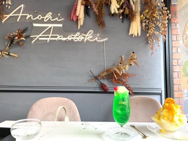 アノヒのロゴがおしゃれなクリームソーダ(770円)は緑のヒスイ、透き通るブルーのシズ、レモン色のコハク、ザクロ味のルビーの4種類です。アクスタと一緒に推し活にも大人気です。