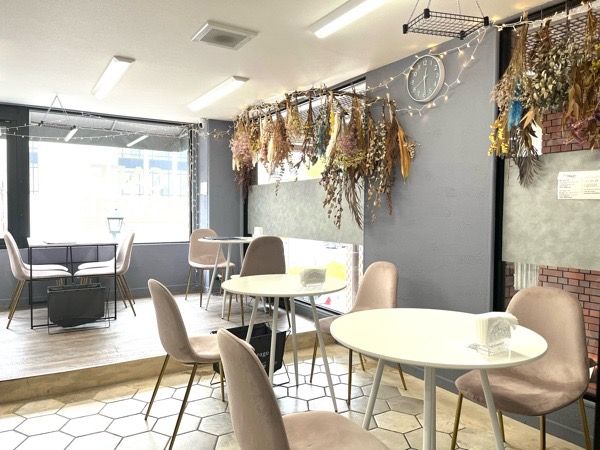 広い店内にはオーナー手作りのドライフラワーがセンス良く飾られています。 落ち着いた色合いは居心地良さを演出してくれます。おひとりさまでも気軽に入れます。 ビルの2階にあるので開放感があり、大きな窓からは北野の町並みを見渡すことができますよ。 かわいい焼き菓子たちに囲まれて幸せ気分にひたれます。