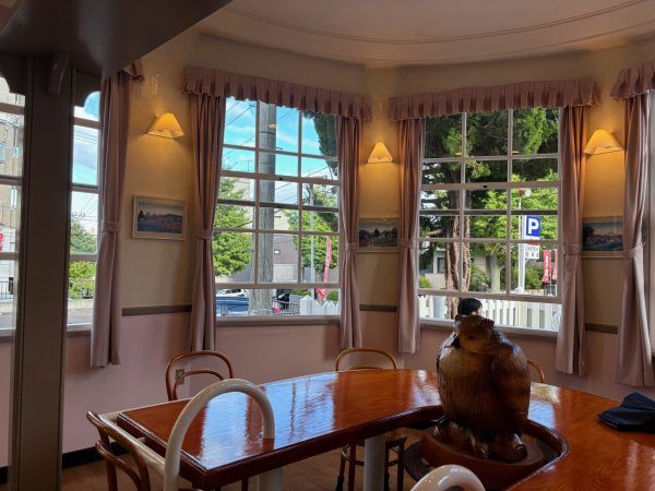 暑さはやわらいできたのですが、外は小樽公園も近いためかカラスもやってくるとの看板があって中でゆっくり食べるのもいいですね。こちらの左側にもテーブル席あります。