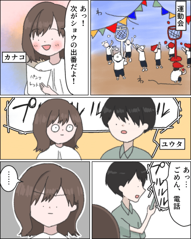 息子ショウくんの運動会当日。「あっ!次がショウの出番だよ!」とカナコさんがご主人ユウタさんに声をかけました。すると「プルルル」と電話が!「あっ・・ごめん、電話」とユウタさんは電話に出るためにその場から離れました。そんなユウタさんを見て「・・・」思わず無言になるカナコさん。