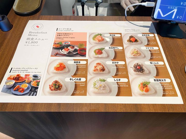 OMO5東京五反田の朝食は、14階のOMOカフェでいただきます。おにぎりセットとアメリカンブレックファスト(パンのセット)の2種類から選べ、おにぎりは10種類の中から好きなものを2つ選択可能