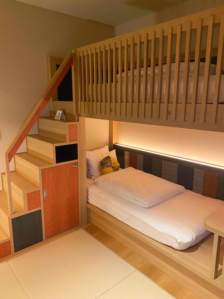 遊び心のあるカラーリングのファブリックや階段下のデザインがすてきで、大人もテンションが上がる客室です。ベッドの下にはお布団が一式入っていたので、こちらのお部屋は最大3人宿泊できます。