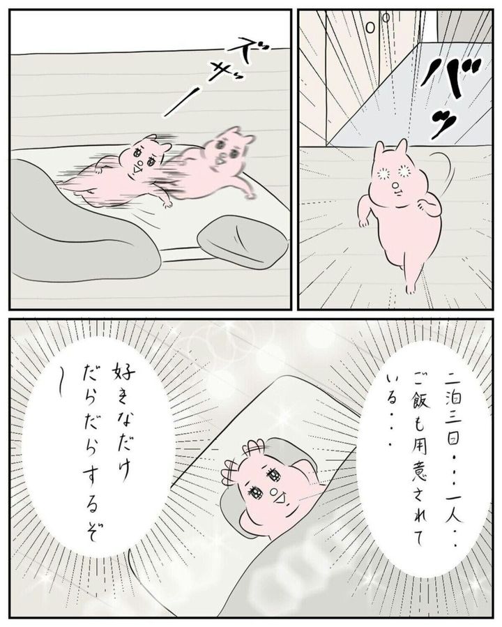 ドアが閉まった瞬間に布団へと走っていったすや子さん。目はキラキラして口角は上がりっぱなしの表情からも、喜びが伝わってきますね。夫が食事も用意してくれたため料理もしなくていいし、好きなだけ自由に過ごせそうです。