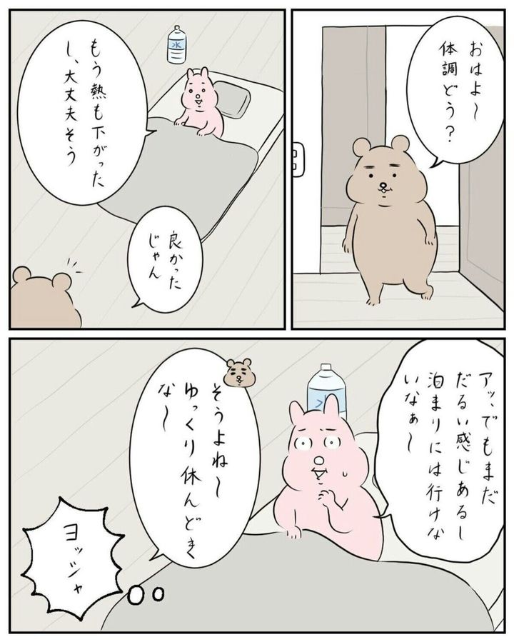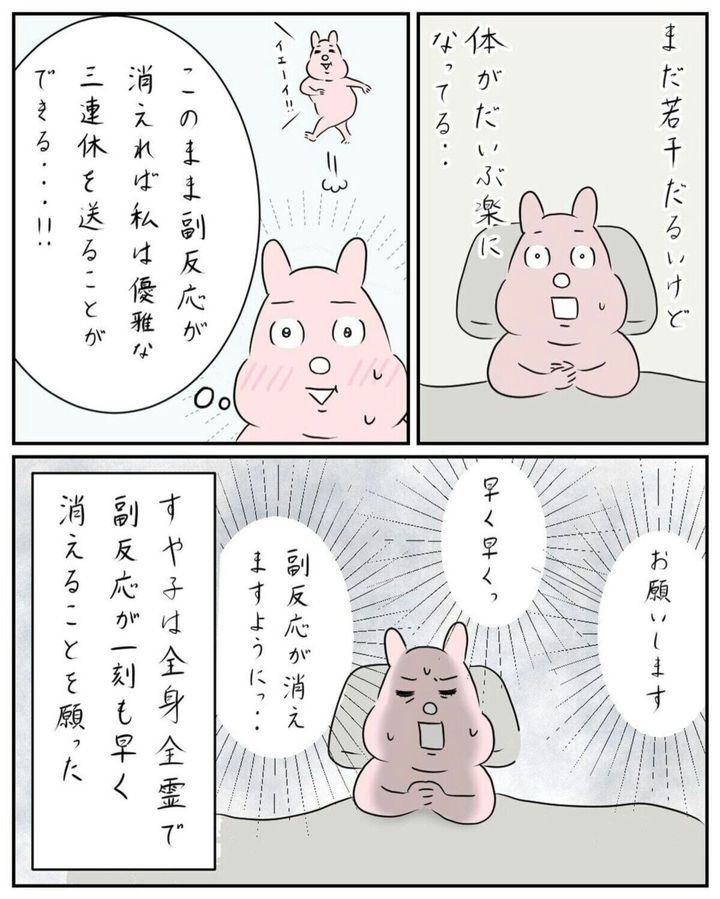 ワクチン接種をした当日の夜はつらそうな様子だったすや子さんでしたが、朝起きると体がだいぶ楽になっていることに気付きます。とにかく一刻も早く副反応が消えることを祈る様子に、1人時間を切望しているのが見てとれますね。