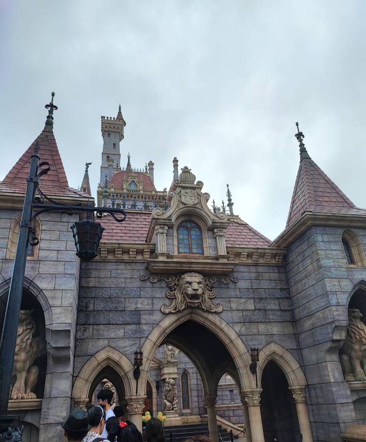 入園するとすぐに、雨が…。幸先不安でしたが、まずはアトラクションに乗ろうという話になり、待ち時間を確認すると、人気の「美女と野獣”魔法のものがたり”」の待ち時間が45分と表示されていました。「これは行くしかない!」と、すぐに向かったのですが、実際に並んだ時間は30分程度で、土日の昼間とは思えない待ち時間で、感動でした。