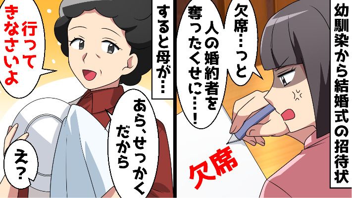それから3年後、なんとミサトから結婚式の招待状が届きました。相手は私の元婚約者。まだ付き合っていたことはもちろん、私を結婚式に招待したことに驚きを隠せません……。