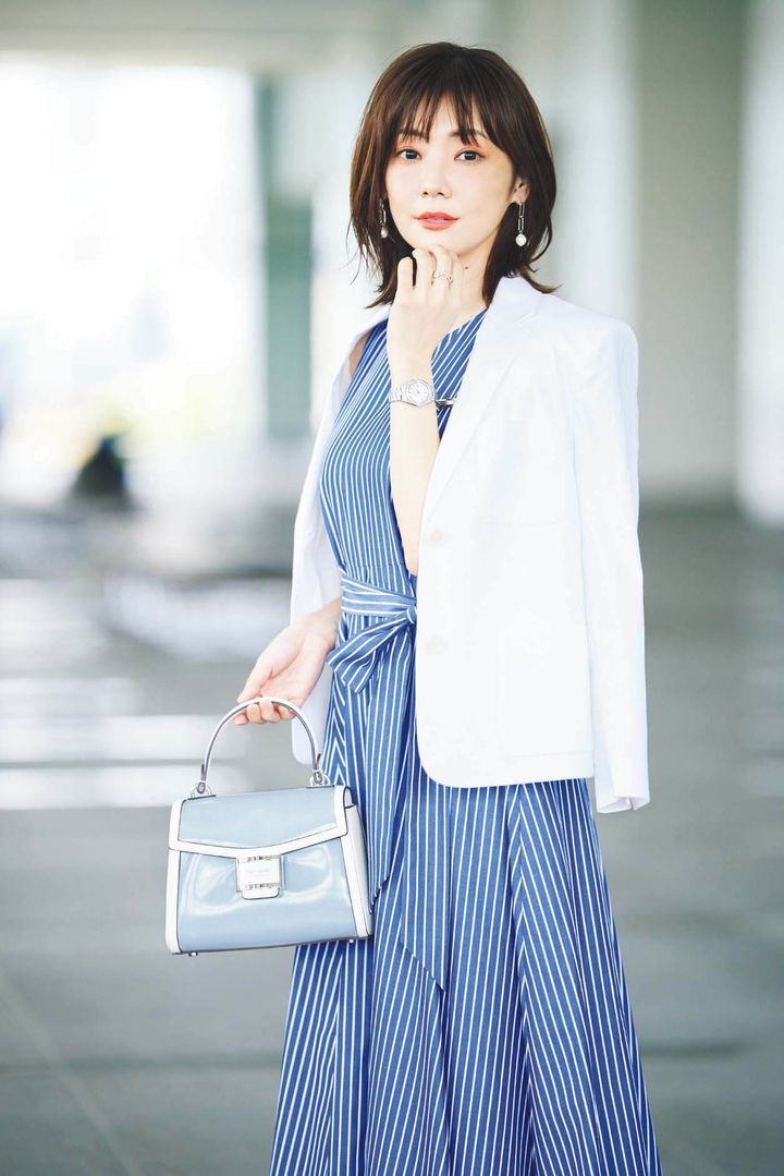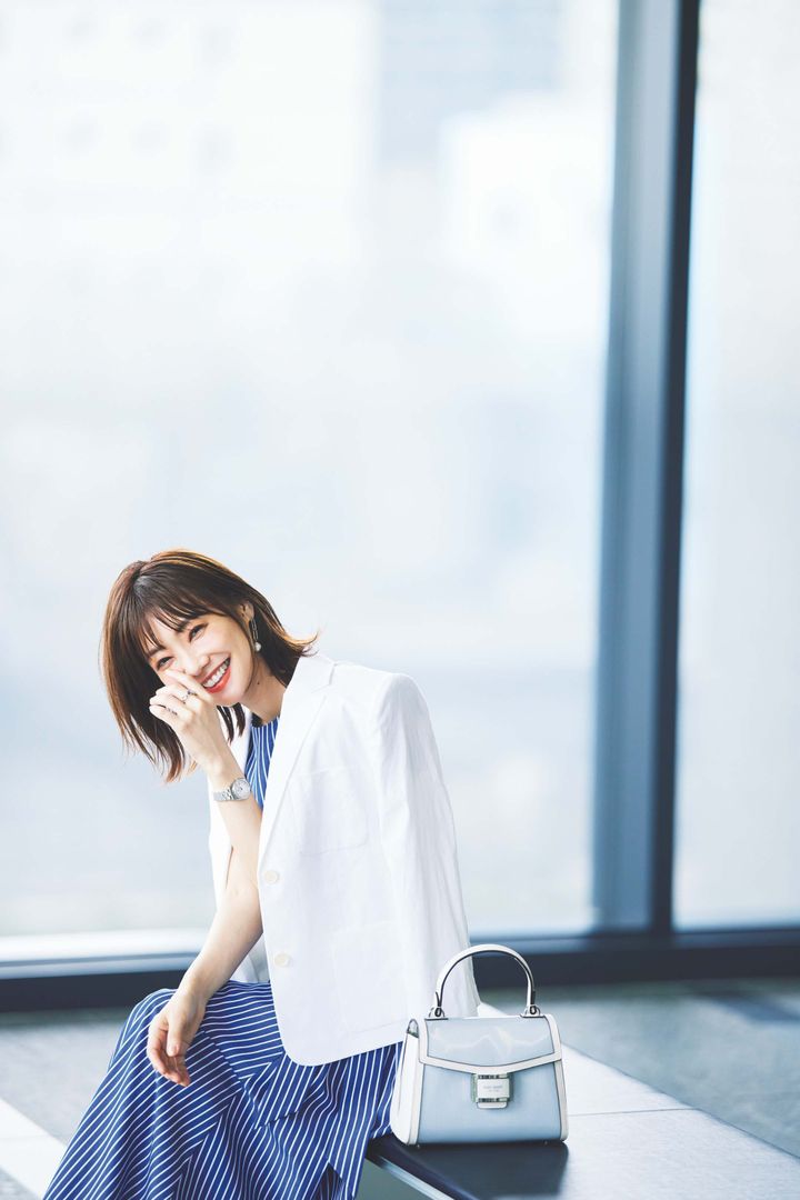 ジャケット¥53,900/セオリー(リンク・セオリー・ジャパン) ワンピース¥41,800/ツル バイ マリコ オイカワ ピアス¥25,300/グロッセ(グロッセ・ジャパン) リング¥24,200/エル・エー・エイチ(ヴァンドームヤマタ) 時計¥759,000/グランドセイコー(セイコー ウオッチ お客様相談室) バッグ¥61,600/ケイト・ スペード ニューヨーク(ケイト・スペード カスタマーサービス) パンプス¥68,200/ペリーコ(アマン)