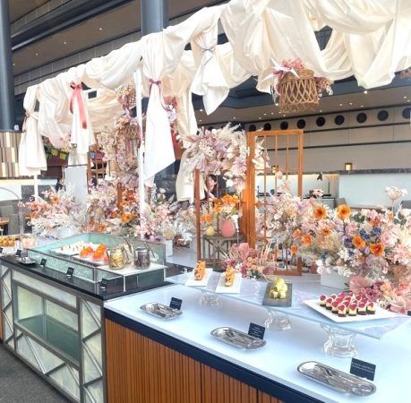 会場は4階のブラッセリ―&ラウンジ シアラです。ダイナミックな吹き抜けのガラス張りで、空間の雰囲気がゴージャス。そのガラス窓は博多湾に面しているので、天気のよい日なら夕焼けを見ながら夕焼けスイーツを楽しめるかも。