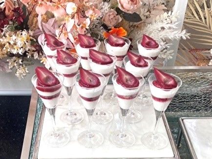 5つ目は「ラズベリー風味の梨のトライフル」です。トライフルとは、イギリスのデザートで、カスタードクリームやスポンジ、フルーツなどを器の中で層状に重ねたものです。語源は中期英語からのものと言われており、「気ままなおしゃべり」などの意味合いがあるそうです。
