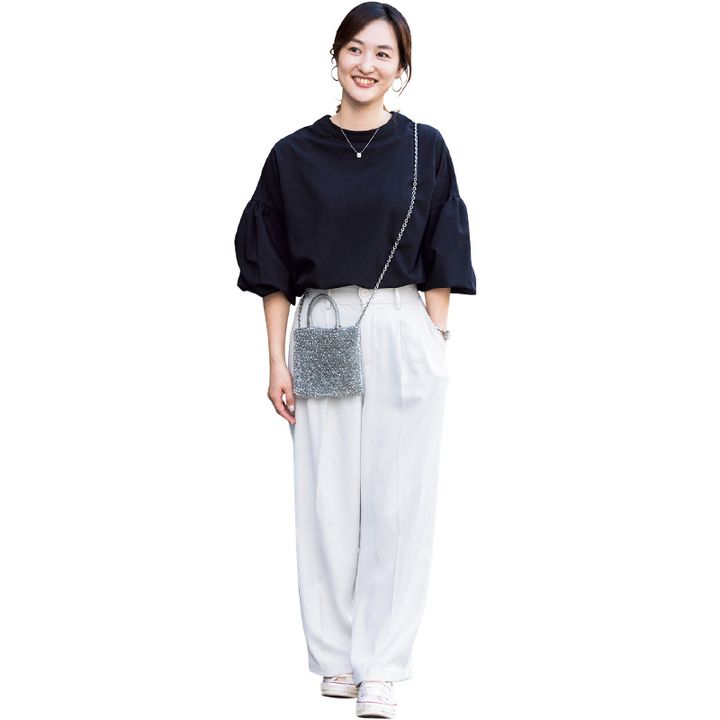 夫の仕事の関係で、今年の春に滞在先のアメリカから帰国。フルタイムで働いているので、他のママとの交流がほとんどないまま今に至るため、親子遠足と言えど万人ウケするキレイめスタイルに。他のママと会うときは着痩せを意識して、二の腕が隠れるぽわん袖のブラウスが私的ベスト。根っからのコンサバ育ちなので、行き先がたとえ動物園でもリエディで購入した白パンツが安心します。