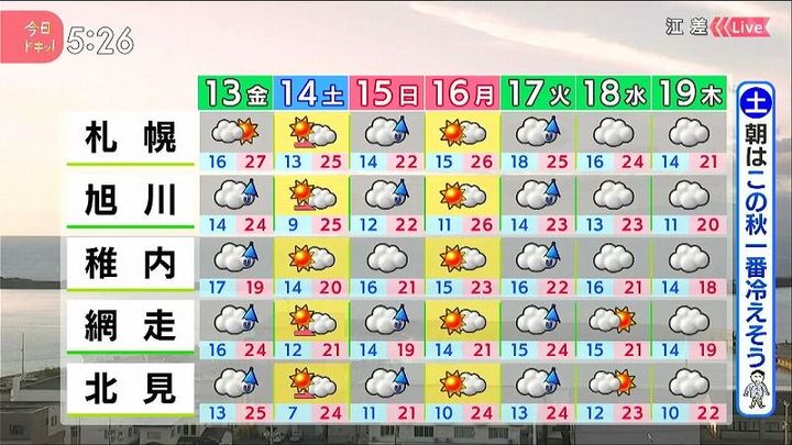連休スタートの土曜日はカラッと晴れますが、朝は札幌でも13度、北見は7度などこの秋一番ヒンヤリするので、寝冷えに注意です。