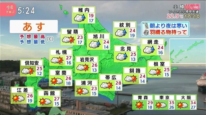 稚内は日中も19度と涼しくなりますが、そのほかは午後から急速に気温が下がります。