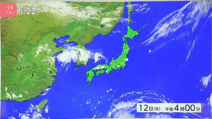 こちらは12日(木)午後4時の雲の様子ですが、北海道付近には目立った雲はなく、晴れのエリアに入っています。北に目を向けると、サハリン方面から大陸にかけて、ところどころ雲の塊があります。