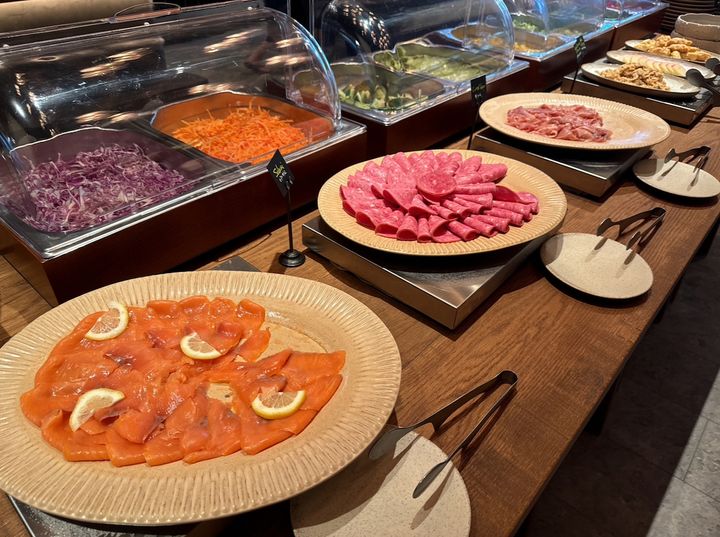 モーニングは洋食のビュッフェ! サラダ、フルーツ、生ハム、アボカド、サーモン、オムレツと、朝なのについ欲張ってしまうメニューばかりでした♡