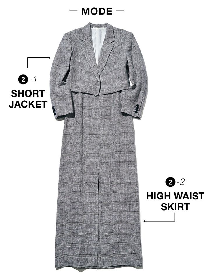 紳士なジャケット、LADYなペンシルスカートのセットは、上下で着てもくどく見えない細かく配したグレンチェック。旬の短め丈ジャケットはゆるくもタイトでもない、飽きずに長く使えるスタンダードなシルエット。対してスカートは、ゆったりめのシャツやニット、アウターにも好相性なIラインシルエット。ハイウエスト+ロングでスタイルアップを約束。 グレージャケット・グレースカート/THIRD MAGAZINE