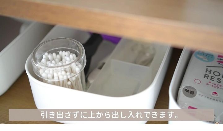 毎日使うものはすぐに手に取り、すぐに戻せる場所に収納。浅型のケースを選ぶと上からのぞいて中身を取り出しやすいですよ。