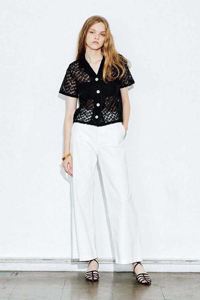 無地の延長で使える、ALL黒で統一した花の刺しゅう。さりげなく甘さをかもし出せるため、ハンサムなモノトーンスタイルにも浮かないアクセントに。肌寒さが気になる日には薄手のカットソーを中に着て、模様が生むニュアンスを強化しても。