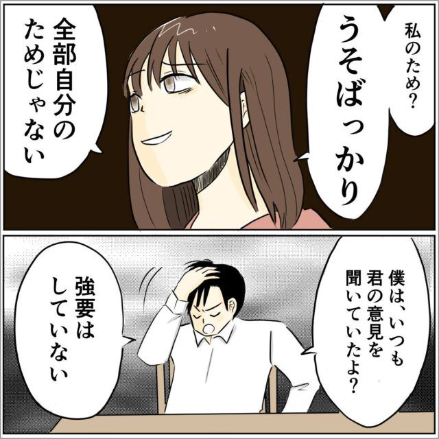 「私のため?うそばっかり。全部自分のためじゃない。」私は呆れて笑いすらこぼれました。「僕は、いつも君の意見を聞いていたよ?強要はしていない。」と夫は言い切りました。
