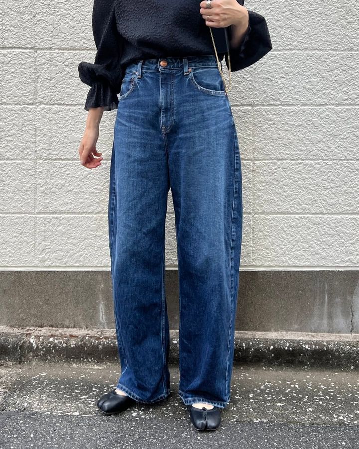 「カジュアルよりもキレイめにデニムをはきたい気分なので、トップスは華のあるシアー素材のブラウスに。ここ数年デニムのトレンドは変化が激しいですが、今の気分は断然カーブデニム。よりキレイな印象にするため濃いめのブルーを選びました」
