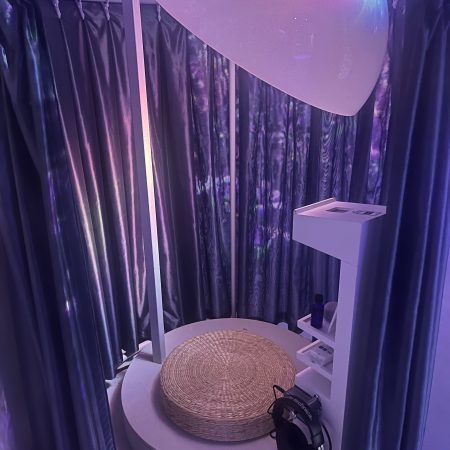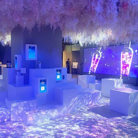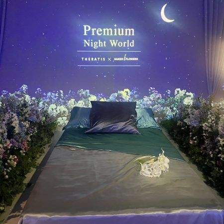 夜活美容を提案する高機能ナイトケアブランドの世界観を楽しめる「Night Time photo spot」には、なんとラグジュアリーなベッドが!「寝室から見る特別な夜」をテーマにしたフォトスポットになっていて、ネイキッドのプロジェクションマッピングで、深夜から朝焼けの空の移り変わりが表現されています。