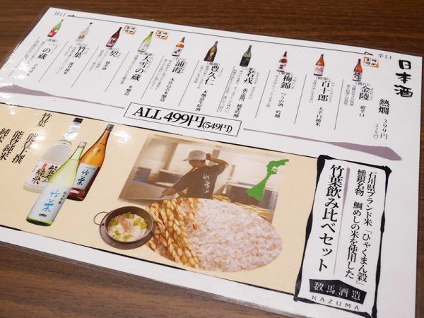 日本酒のラインナップには、鯛めしに使われている石川県のブランド米「ひゃくまん穀」を使った「竹葉」も。 その他の日本酒もリーズナブル価格なので、日本酒好きの方なら飲み比べも楽しめそうです。