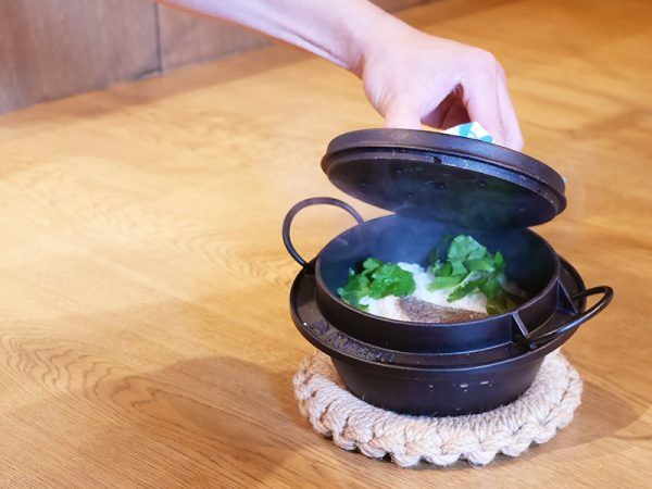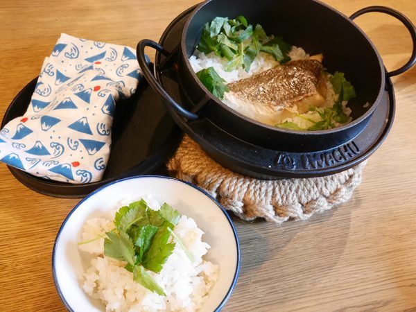 鮮魚の一本焼きと並ぶ燻銀名物が、鯛めし(写真は2合炊き)。 注文を受けてから、南部鉄器でじっくりと時間をかけて炊き上げるので注文はお早めに。 蓋をあけて湯気と香りが立ち上る瞬間は、歓声が上がります。