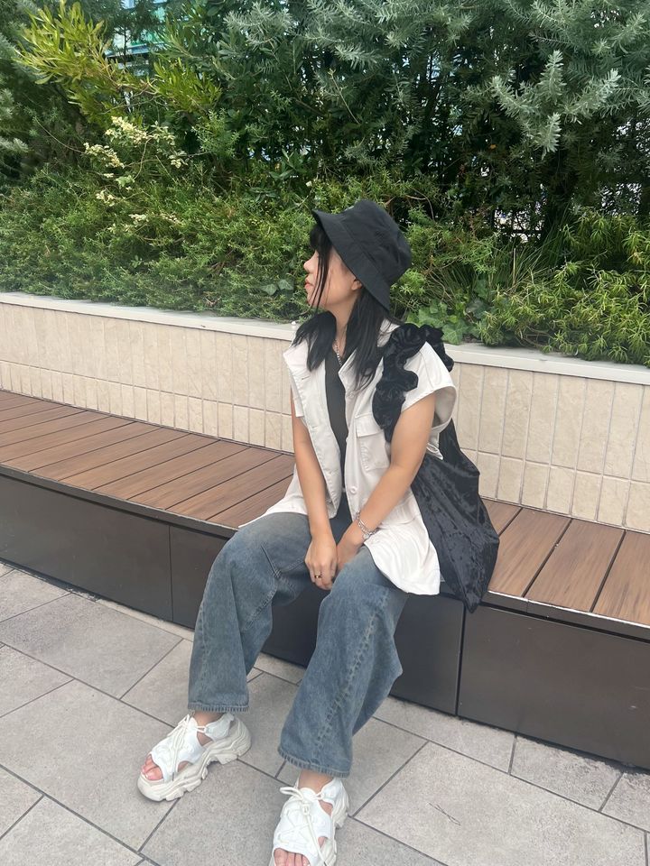 ノースリーブに足元はサンダルで、気温35℃でも快適に過ごせるコーディネートを意識しました。