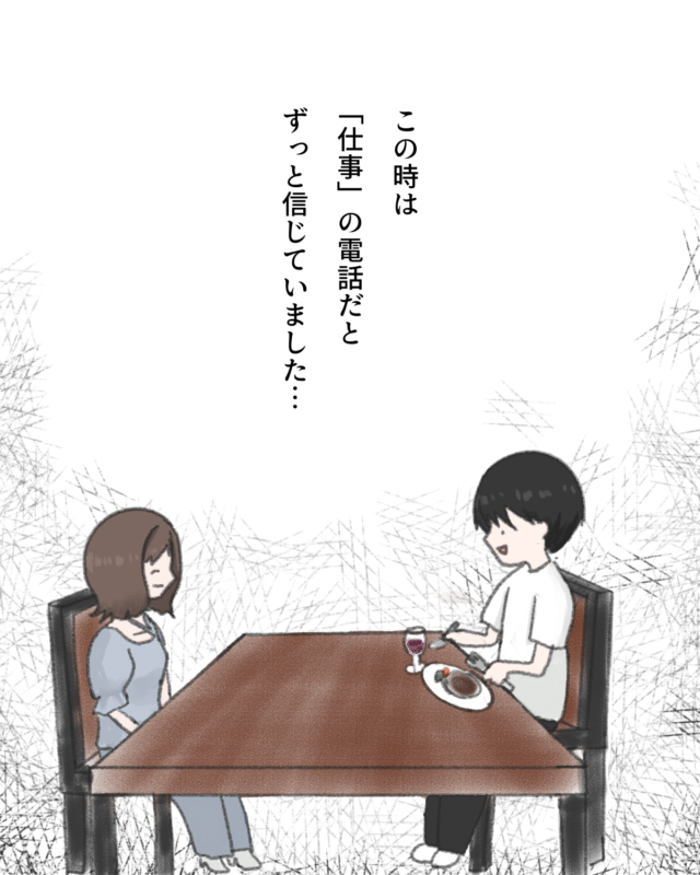 そしてまた別の日に、レストランで食事をしていたカナコさんとユウタさん、すると「プルルル・・」ユウタさんの電話が鳴りました。「ほんっとごめん。また電話(汗)」そう言ってスマホ画面を見たユウタさんは「先食べてて」とカナコさんに声を掛け席を立ちました。「うん。大丈夫」カナコさんはそう答え、1人で食事を始めました。その後、「食べ終わっちゃった」なかなか戻って来ないユウタさんを待ちながら1人で食事を終えてしまったカナコさん、すると「ほんと、ごめんね。おまたせ」とユウタさんが戻って来ました。「料理冷めちゃってるけど大丈夫?」カナコさんがたずねると「うん。大丈夫」と答え食事を始めたユウタさん。この頃は「仕事」の電話だとずっと信じていたカナコさんでした。