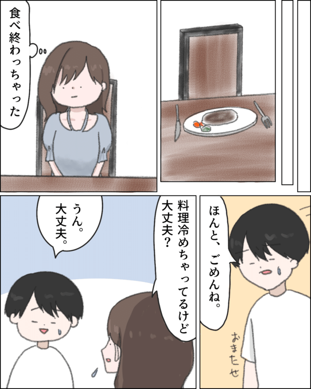 その後、「食べ終わっちゃった」なかなか戻って来ないユウタさんを待ちながら1人で食事を終えてしまったカナコさん、すると「ほんと、ごめんね。おまたせ」とユウタさんが戻って来ました。「料理冷めちゃってるけど大丈夫?」カナコさんがたずねると「うん。大丈夫」と答え食事を始めたユウタさん。