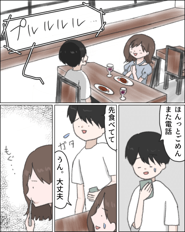 そしてまた別の日のこと。レストランで食事をしていたカナコさんとユウタさん、「プルルル・・」ユウタさんの電話が鳴りました。「ほんっとごめん。また電話(汗)」そう言ってスマホ画面を見たユウタさんは「先食べてて」とカナコさんに声を掛け席を立ちました。「うん。大丈夫」カナコさんはそう答え、1人で食事を始めました。