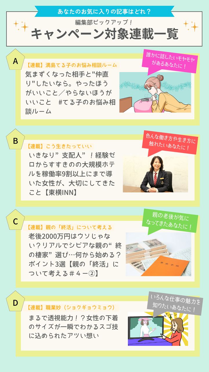 応募方法:対象の記事の中から「あなたのお気に入り」の1本を選び、「応募フォーム」から応募してください。
