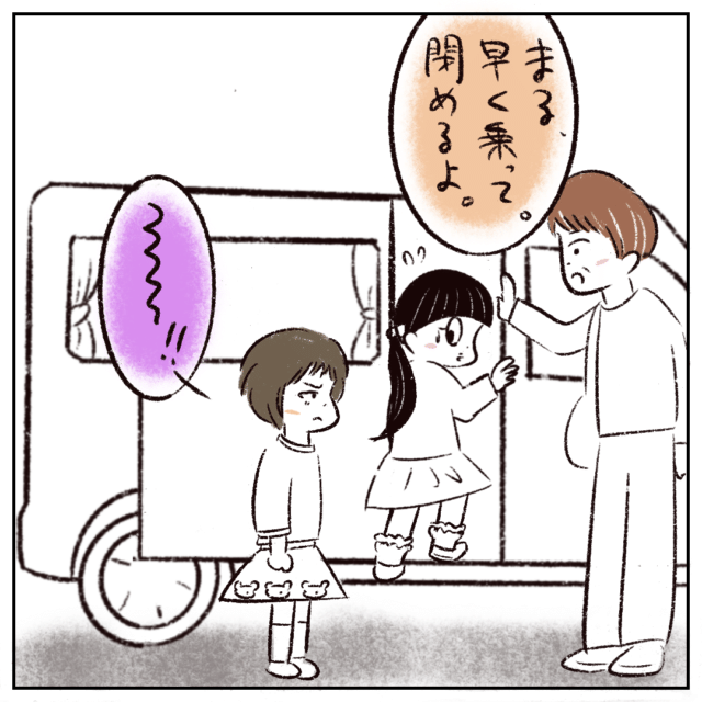 ずるいと泣き叫びながら車のドアを叩く友達。私の友達に冷たかった母[23]|まるの育児絵日記