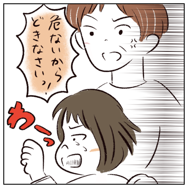 お母さんは「危ないからどきなさいっ!」とドアを叩くさなかちゃんを止めに入ります。