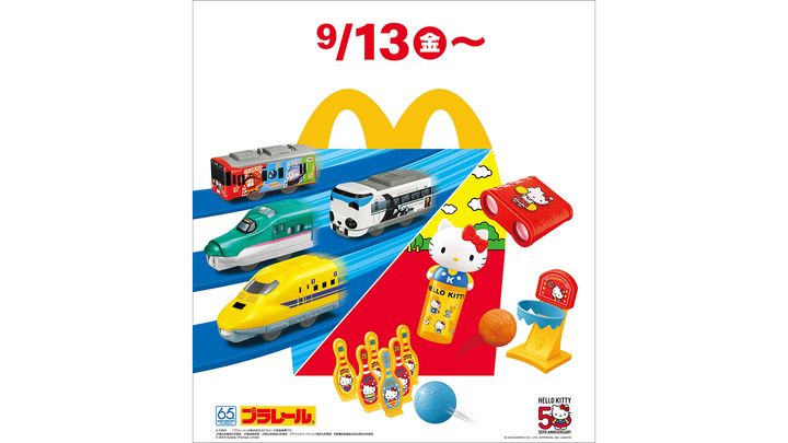 ハッピーセット「プラレール」「ハローキティ」が、9月13日(金)から期間限定で全国のマクドナルドにて発売します。9月14日(土)~9月16日(月・祝)の3日間は、「プラレール スペシャルDVD2024」「ハローキティ ビッグシール」の週末プレゼントももらえます。