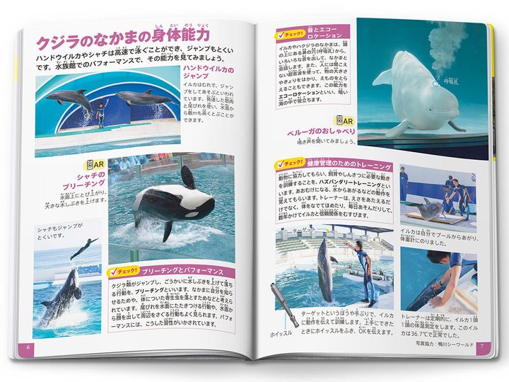 今回のテーマは「水族館」。鴨川シーワールドの協力のもと、シャチやベルーガ、アシカなど、海の生物の写真を撮り下ろし。また水族館のお仕事についても知ることができ、水族館について凝縮したミニ図鑑です。スマートフォンで図鑑のARマークを読み込むと、海の生物たちの動画や鳴き声を再生することができます。おでかけのお供として楽しめますね。