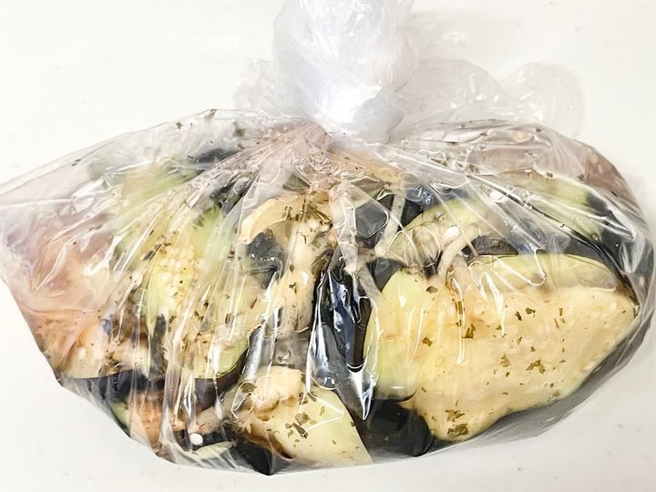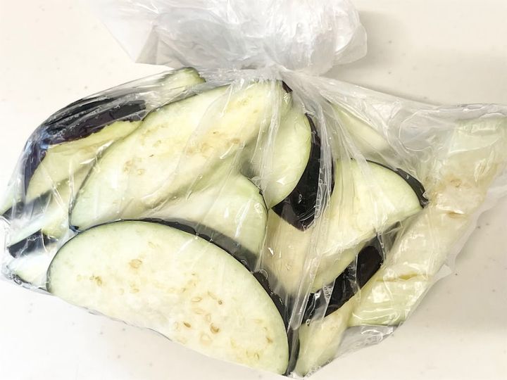 2. 1のなすをザルにあけ、水気を絞って袋に入れます。