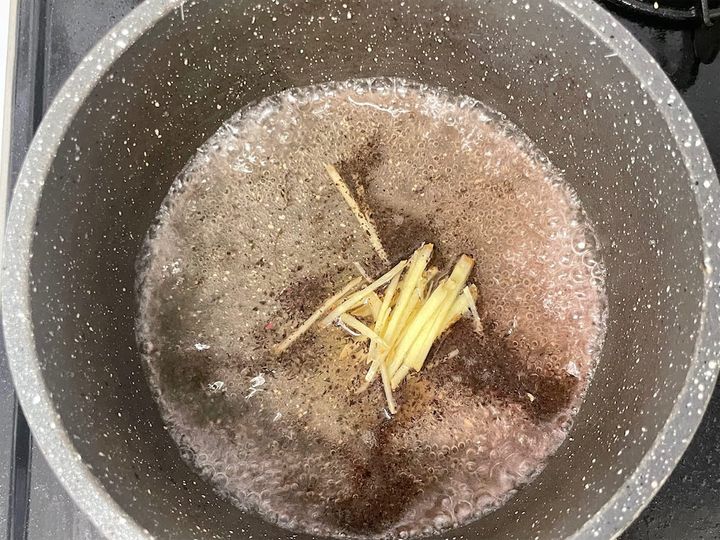 1. 鍋に[A]を入れて混ぜ、しょうがを鍋に入れたら火にかけて沸かします。