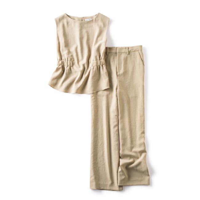セットアップで着こなしの幅を広げて。ベージュノースリーブブラウス¥13,000ベージュワイドパンツ¥22,000(ともにルーニィ)