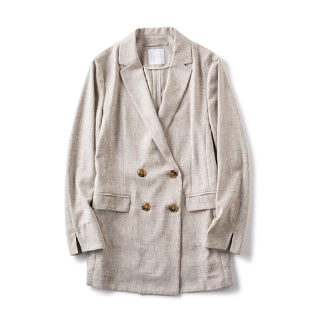 夏のジャケットスタイルがさわやかにキマル、ベージュ。たちまち旬っぽい着こなしに。リネン風ジャケット¥24,000(TONAL)