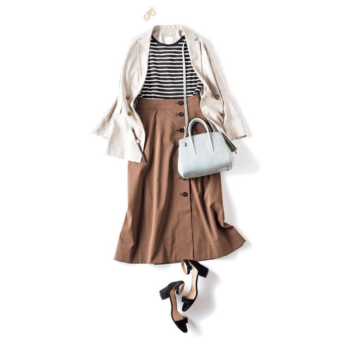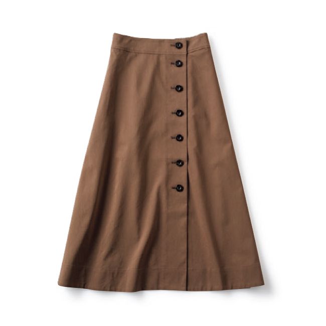 広がりすぎないデザインが大人らしい。こげ茶で洗練度を高めて。Aラインスカート¥5,500(グローバルワーク/アダストリア)