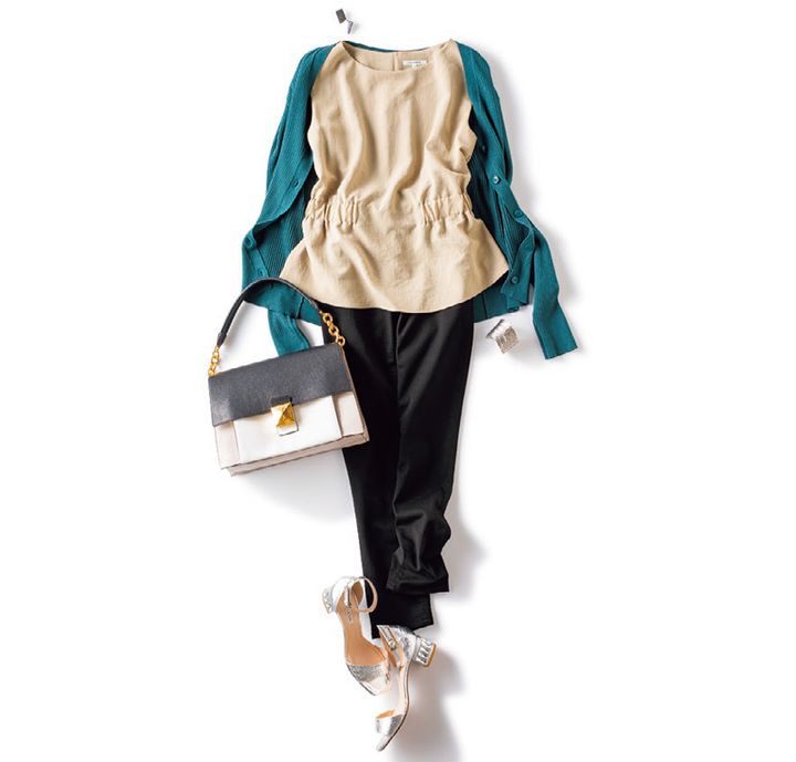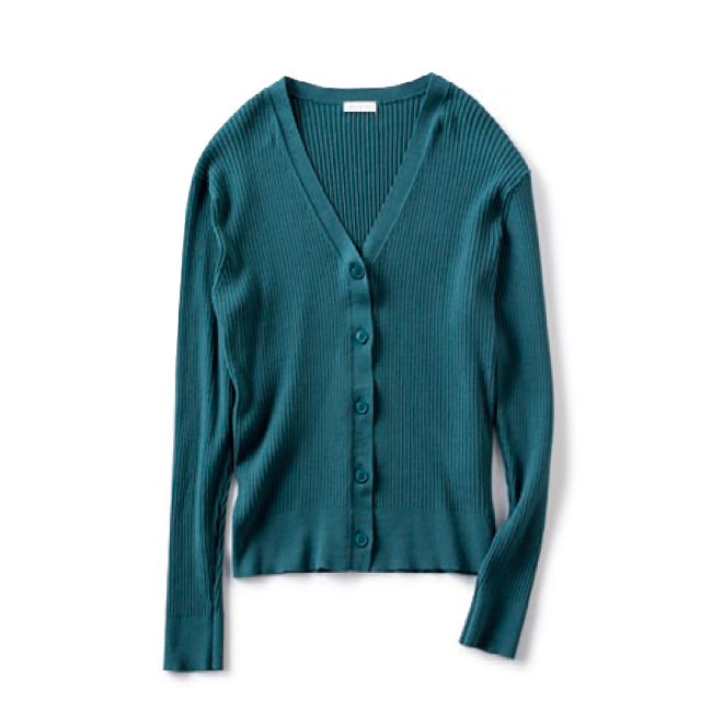 冷房対策用に常備しておきたい必需品。深いグリーンで今年らしく。リブカーディガン¥14,000(リトラル/ゲストリスト)