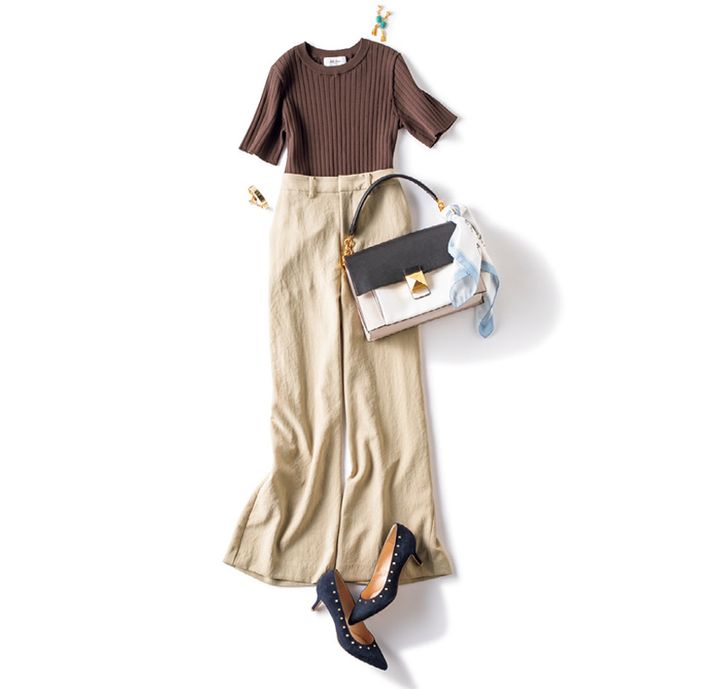 定番のニットは今年らしいブラウンをセレクトして。ブラウンリブニットTシャツ¥4,800(Mila Owen/Mila Owenルミネ新宿2店)