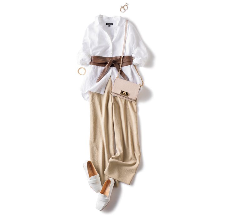 ベルト¥3,800(RD ルージュ ディアマン)バッグ¥49,000(FURLA/FURLA JAPAN)ローファー¥24,000(ファビオ ルスコーニ/ファビオ ルスコーニ 六本木店)ピアス¥2,200(アネモネ/サンポークリエイト)ブレスレット¥12,500(アビステ)