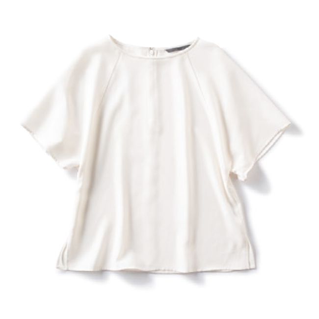 落ち感のある白ブラウスは女性ならではの清潔感が。洗えるから汚れても心配なし。白ブラウス¥19,000(Bability/BOSCH)